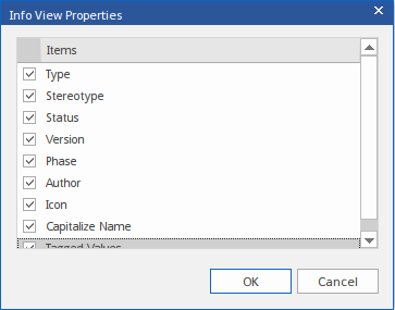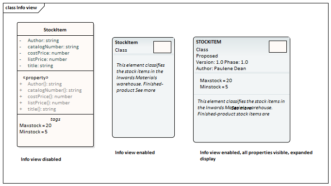 The properties listed in the top left of the element are customizable. The list defaults to show the element type and stereotype (where a stereotype exists) but you can chose to hide one or both of those properties, and to show any or all of the element Phase, Version, Status, Author and (for an element in the Requirement group) Priority. Those five properties are not shown on the element when Info view is disabled. You can also hide the native-shape icon on the element, display the element name in capitals, and display the element's Tagged Values compartment while in Info view (the Tagged Values compartment must also be enabled in either the diagram 'Properties > Elements' page or the element 'Compartment Visibility' dialog).