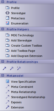工具箱还包含一组配置文件助手,可提供模板和对话框,帮助您在MDG技术中创建刻板印象配置文件,工具箱配置文件和图表配置文件。