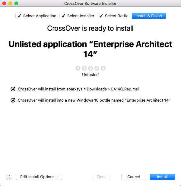 此页面描述了在macOS下使用CrossOver安装Enterprise Architect的过程。假设您已在计算机上安装了CrossOver,并且已经下载了Enterprise Architect的最新安装程序。