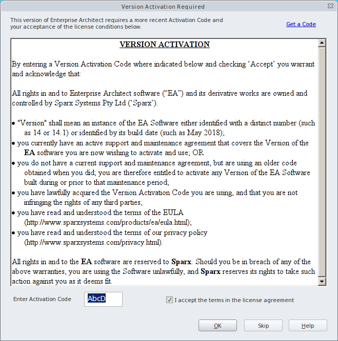 从版本14开始,Enterprise Architect要求您通过输入一个简单的四字母代码来“激活”您安装的软件版本,确认您有权运行特定版本的Enterprise Architect。首次运行Enterprise Architect时,将自动显示“ 版本激活”窗口,提示您激活已安装的软件版本。