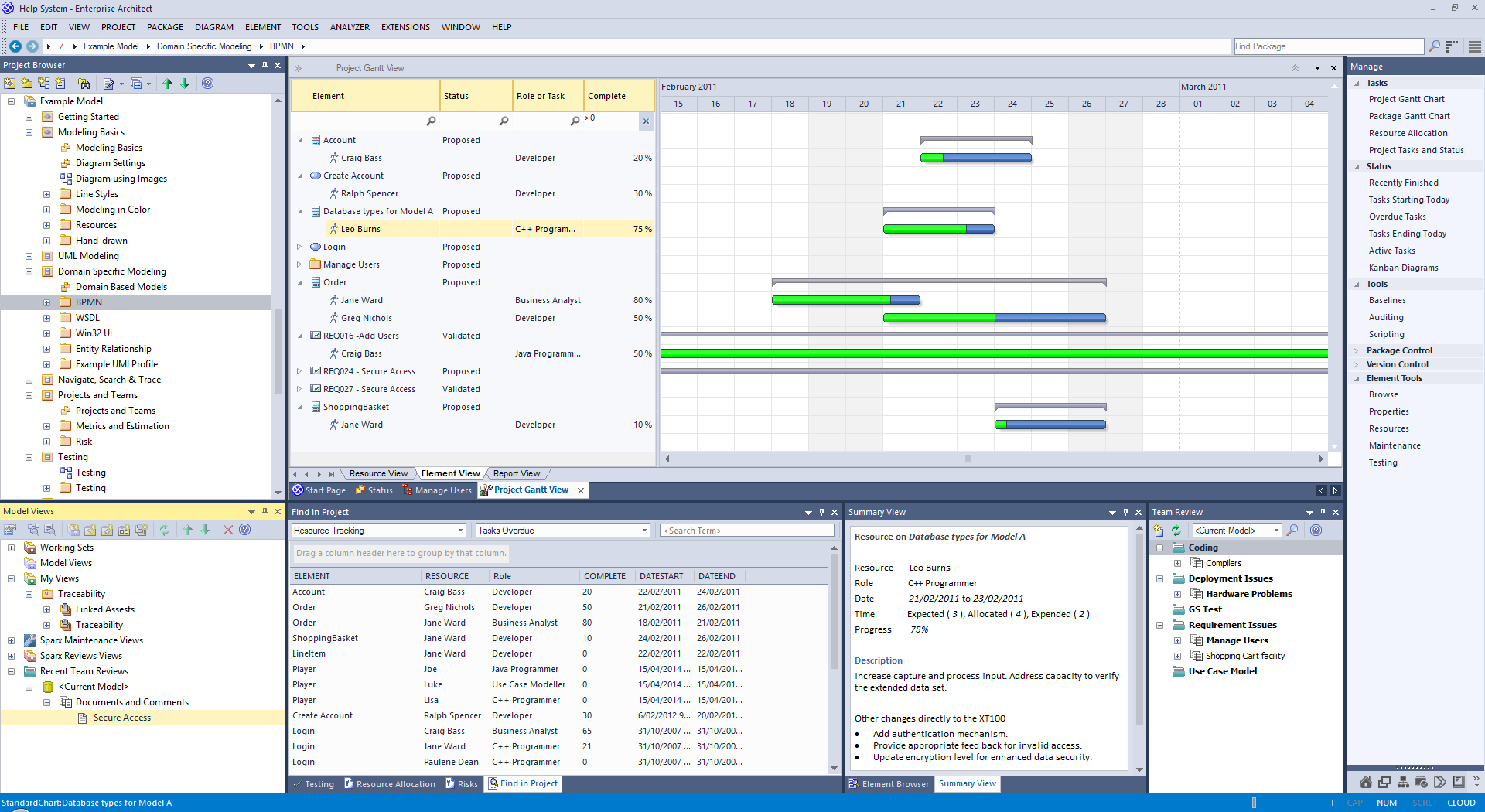 此图像集突出显示了甘特图的一些关键功能,以及它如何与Enterprise Architect中的其他工具进行交互。 |