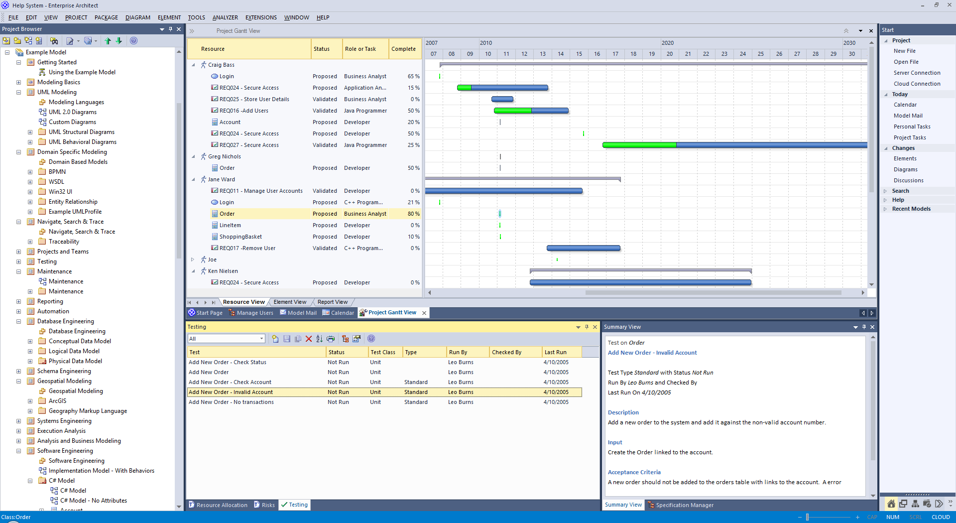 在Enterprise Architect中,您可以以甘特图格式可视化元素和分配项目资源,以查看特定项目和项目特定部分的工作细分。Project Gantt View通过显示已分配资源的开始和结束日期来说明项目计划,以便项目经理可以使用百分比完成条形阴影和百分比完成,资源名称和状态列快速查看当前项目状态。可以过滤信息,并且可以快速突出显示和识别过期项目。
