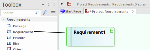单击工具箱中的相应图标以选择要创建的元素类型(在此示例中为Requirement元素)。 元素类型在工具箱中突出显示。 |