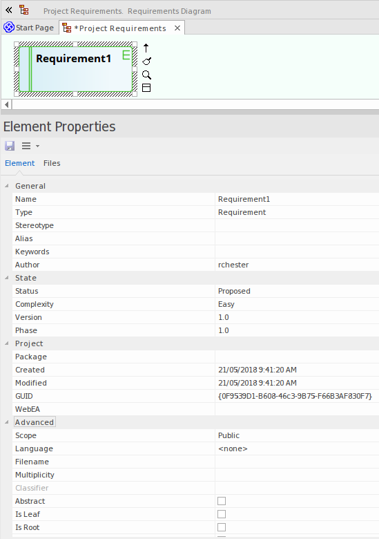 模型由元素构成,每个元素都有自己的含义,规则和符号。通常,在模型中创建新元素时,您希望在图表上使用该元素。最简单的方法是直接在图上创建元素。在此过程中,我们将使用Requirement元素作为示例。