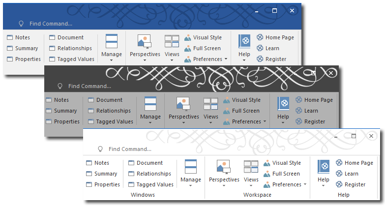 可以更改Enterprise Architect用户界面的整体样式和颜色,以匹配许多Microsoft Office和Visual Studio产品版本的标准样式(或主题)。样式均匀地应用于所有显示,对话框,窗口,视图和色带。