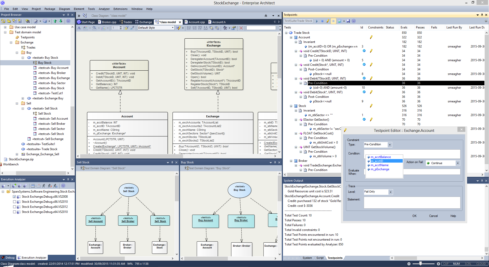 Testpoints Management provides a facility to define the constraints on a Class model as contracts. The contracts provide the assets on which to create Test domains. A single Testpoint domain can then be used to test and report the behavior of multiple applications. You can also use the Execution Analyzer to record a Use Case and generate a Test Domain diagram with very little effort. Any existing Testpoints are automatically linked to the generated domain or the Test Domain diagram can be used as the context for new contract compositions. How an application behaves for a given Test domain can be seen immediately in real time! Results are displayed in the Testpoint report window every time a contract is passed or failed. The decoupling of test measurement from the code-base has a number of benefits, one of which is aiding the reconciliation of multiple systems with a common Test domain, rather than one another. The Testpoint system supports these contracts: