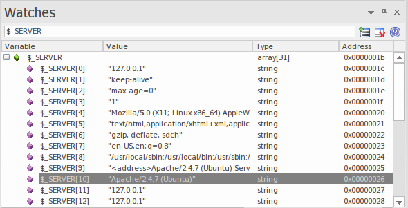 When you are at a breakpoint, you can examine the values of PHP globals using the Analyzer Watch window. To list every global, type either 'globals' or 'superglobals' into the field. To show an individual item, enter its name. This image shows the value of the PHP environment variable $_SERVER being displayed.