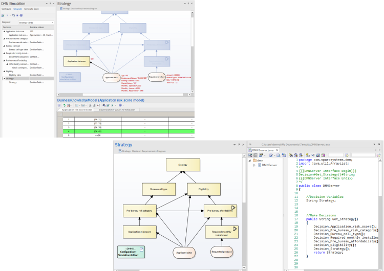基于DMN的模型仿真也支持配置和逐步执行规则集的工具。 对于各种语言,代码生成也是可能的。